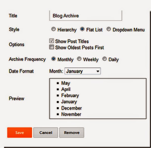 Chose the Flowing Option Show in the screenshot. Choose.Choose style as flat list. Unchecked "show oldest Posts First" Choose archive Frequency as monthly and date format can set to anything.